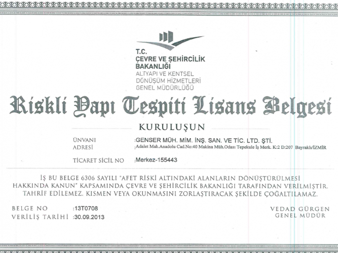 Genoser Yapı Mühendisliği, riskli yapı tespiti için Çevre ve Şehircilik Bakanlığı tarafından yetkilendirilmiştir ve faaliyetlerini 8 kişilik uzman teknik ekibiyle sürdürmektedir.